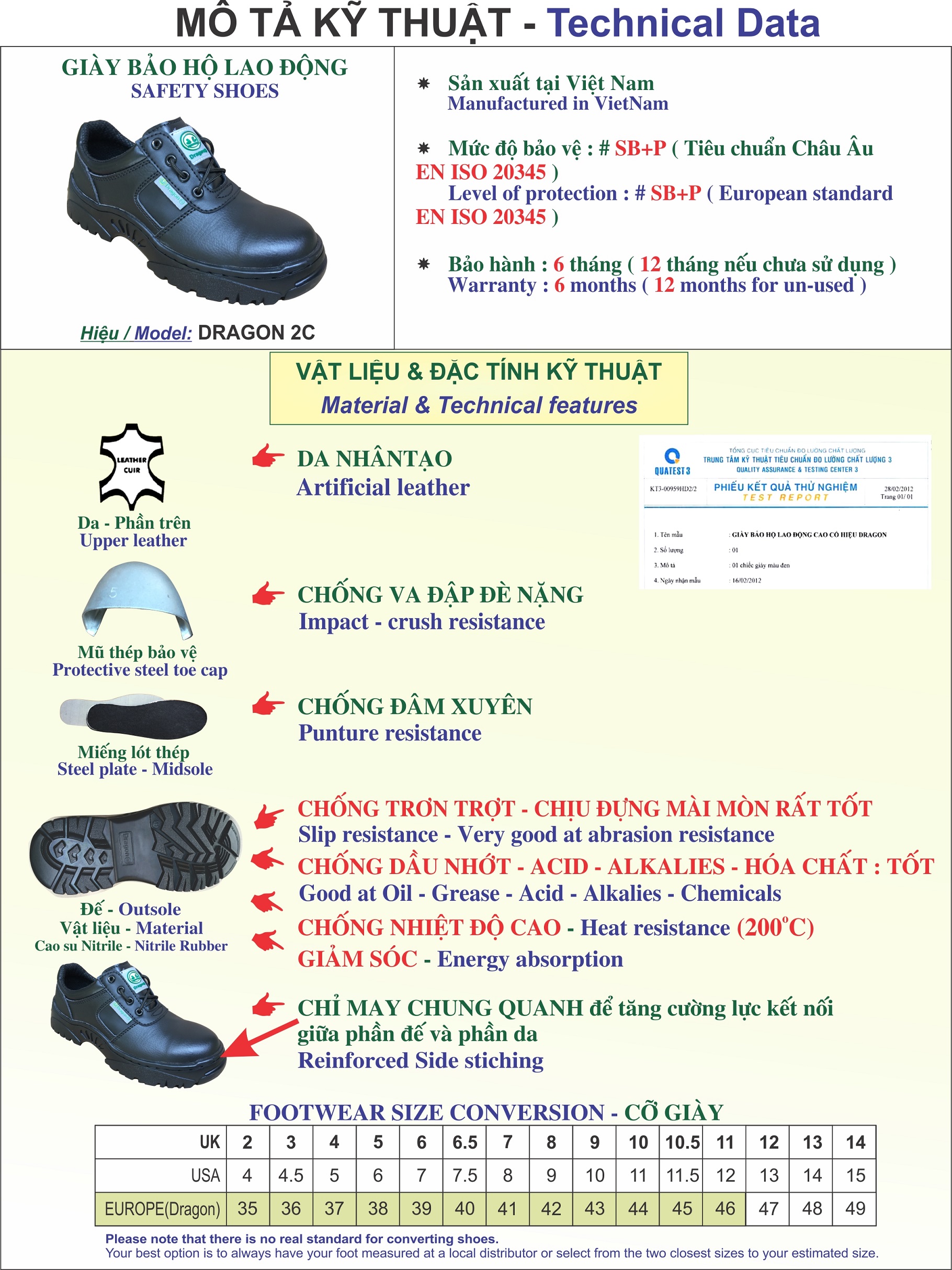 Giày bảo hộ lao động Dragon 2C thấp cổ được sản xuất tại Việt Nam. Được thiết kế ôm sát bàn chân, êm ái, chắc chắn giúp bảo vệ bàn chân khỏi các nguy cơ mất an toàn trong lao động. Với các tính năng chống dập ngón, chống đâm xuyên, chống va đập, chống trơn trượt, chống dầu, chống thấm nước, giày Dragon 2C rất được ưa chuộng sử dụng tại các nhà máy, công trường, công xưởng sản xuất.