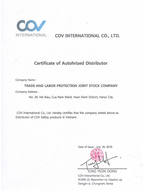 Hãng COV Internatinal là nhà sản xuất uy tín hàng đầu các trang thiết bị bảo hộ lao động tại Hàn Quốc. Được thành lập từ năm 2005, đến nay COV đã có 3 nhà máy lớn tại Hàn Quốc và 1 nhà máy tại Bà Rịa Vũng Tàu, Việt Nam. Các sản phẩm trong lĩnh vực bảo hộ lao động của COV bao gồm Dây an toàn, Giày bảo hộ và Mũ bảo hộ. Các sản phẩm này hiện đang được sử dụng rất nhiều và được đánh giá cao tại Hàn Quốc. Việc thành lập nhà máy sản xuất tại Việt Nam chứng tỏ quyết tâm cao trong việc phát triển mở rộng thị trường trong khu vực Đông Nam Á đầy tiềm năng. Các sản phẩm dây an toàn và mũ bảo hộ của COV sản xuất tại nhà máy ở Việt Nam đều được sản xuất trên dây chuyền hiện đại nhập khẩu từ Hàn Quốc, nguyên liệu được nhập trực tiếp từ Hàn Quốc và tuân thủ nghiêm ngặt về quy trình sản xuất cũng như kiểm tra chất lượng theo tiêu chuẩn an toàn lao động của Hàn Quốc. Tất cả các sản phẩm này đều đã được xuất khẩu ngược lại Hàn Quốc và đều đã đạt được các giấy chứng nhận chất lượng tại thi trường nội địa Hàn Quốc.